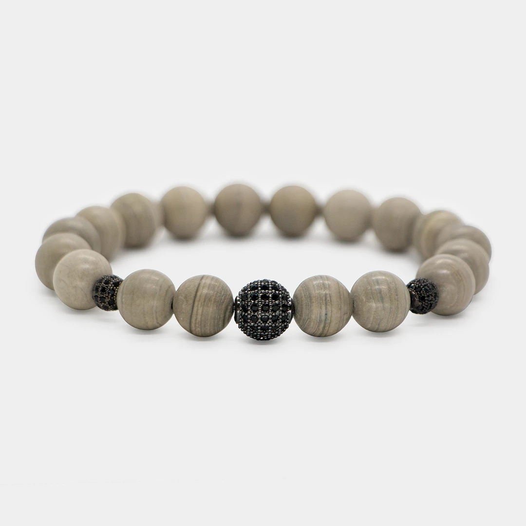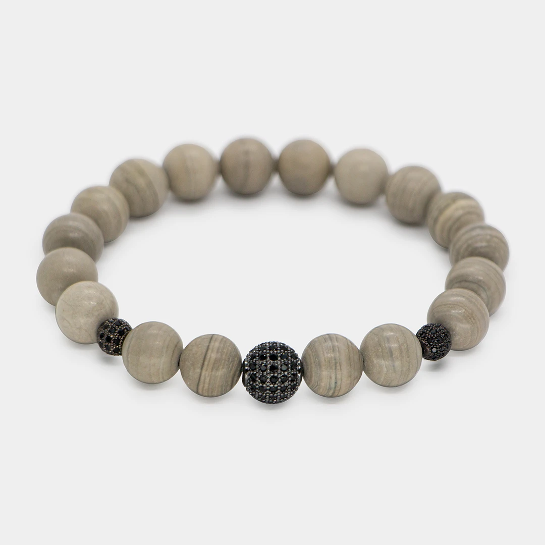 Qara zirkon daşlı klon ilə birlikdə hazırlanmış Boz Zolaqlı Yəşəm (Jasper) Qolbaq ilə təbiətin enerjisini biləyinizdə daşıyın. Bu unikal qolbaq premium aksesuar olmaqla bərabər mənəvi tarazlıq və qorunma mənbəyidir. Daha çox +